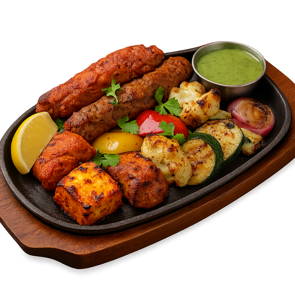 Große Auswahl gegrillter Klassiker: Chicken Tikka, Seekh Kebab, Paneer Tikka und Tandoori Wings. Serviert mit hausgemachter Minzsoße – ideal für Unentschlossene.