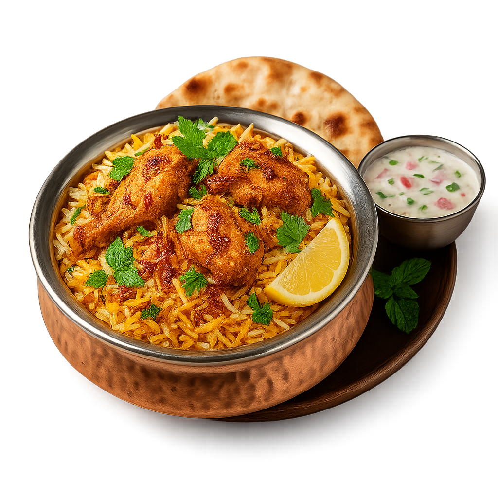 Zartes Hähnchenfleisch, mariniert in Joghurt und Gewürzen, geschichtet mit duftendem Basmatireis, Röstzwiebeln und Minze. Ein aromatisches Festgericht aus Hyderabad – kräftig, aber nicht scharf.
