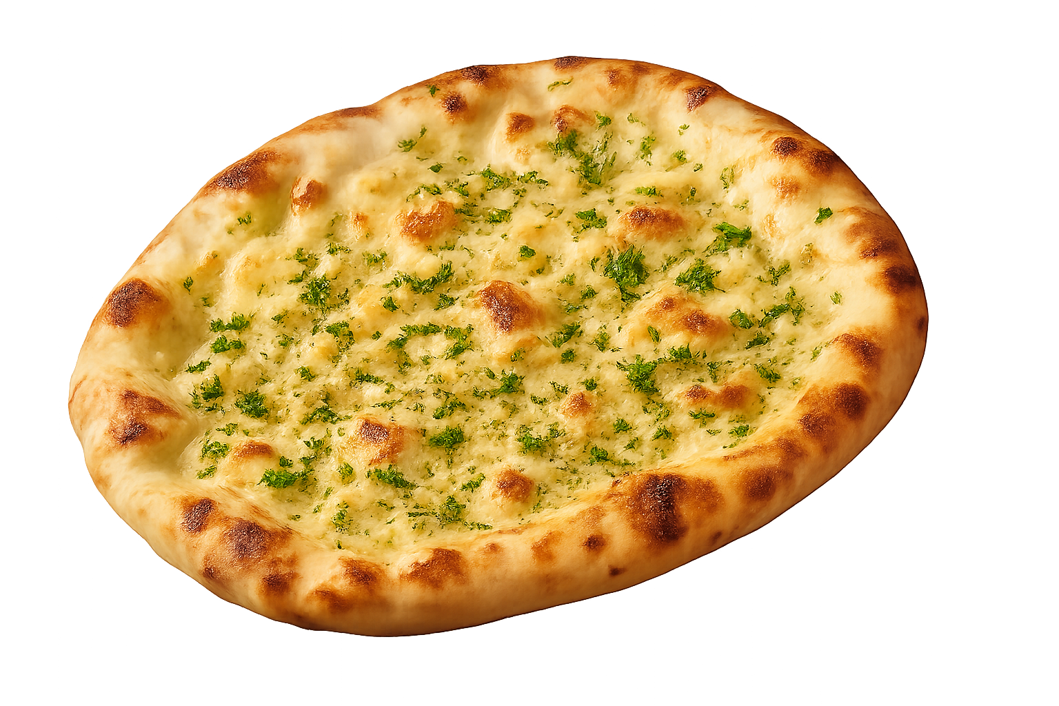 Weizenfladenbrot aus dem Tandoor, verfeinert mit frischem Knoblauch und Koriander. Kräftig im Geschmack und ideal zu würzigen Currys.