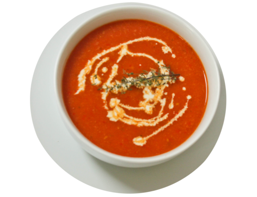 Fein pürierte Suppe aus sonnengereiften Tomaten, verfeinert mit Sahne, Butter und einer milden Gewürzkomposition. (G)